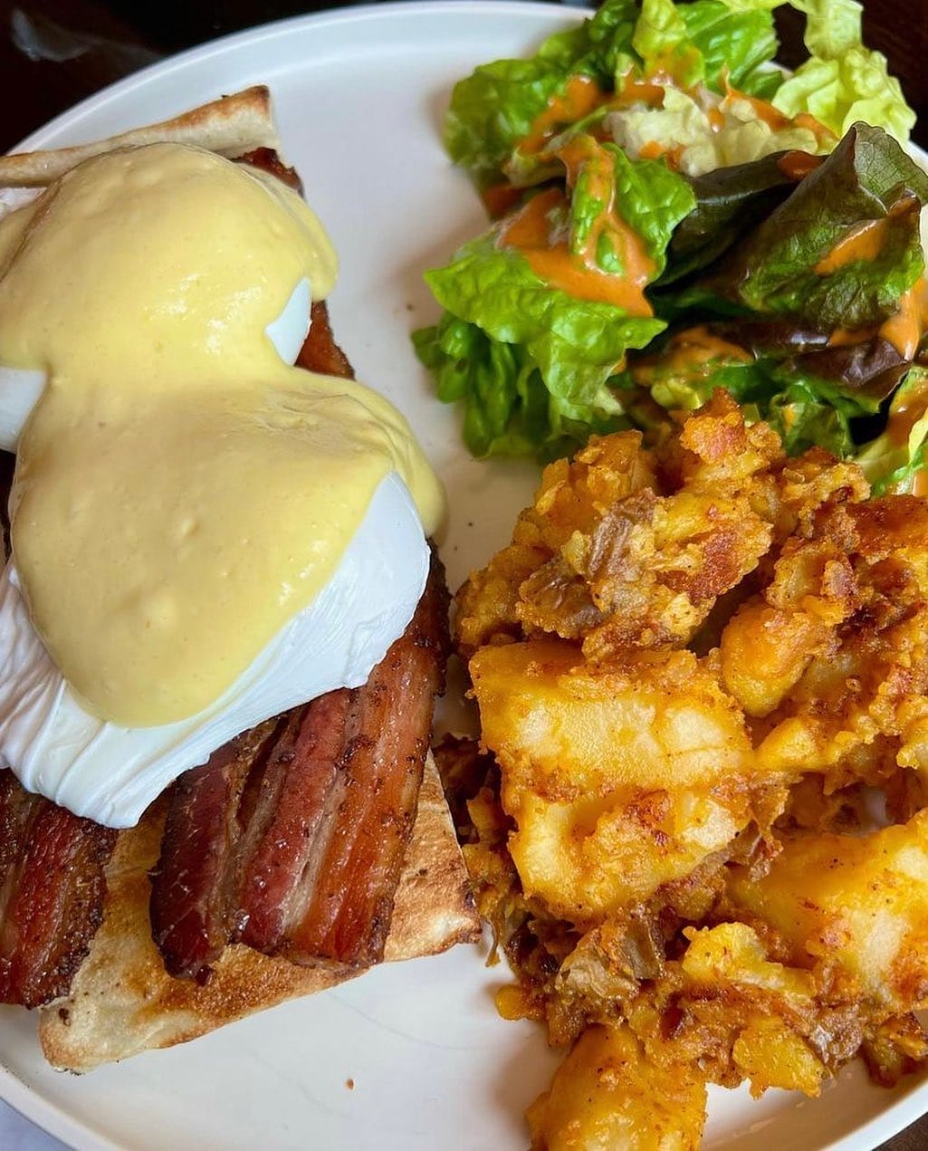 House on Parliament in Toronto offers a delightful twist on the classic Eggs Benedict with their “Eggs Parliament.” This dish features two poached eggs atop a toasted English muffin, complemented by smoked mozzarella, crispy double-smoked bacon, and a flavorful plum tomato chutney, all generously covered with rich hollandaise sauce.