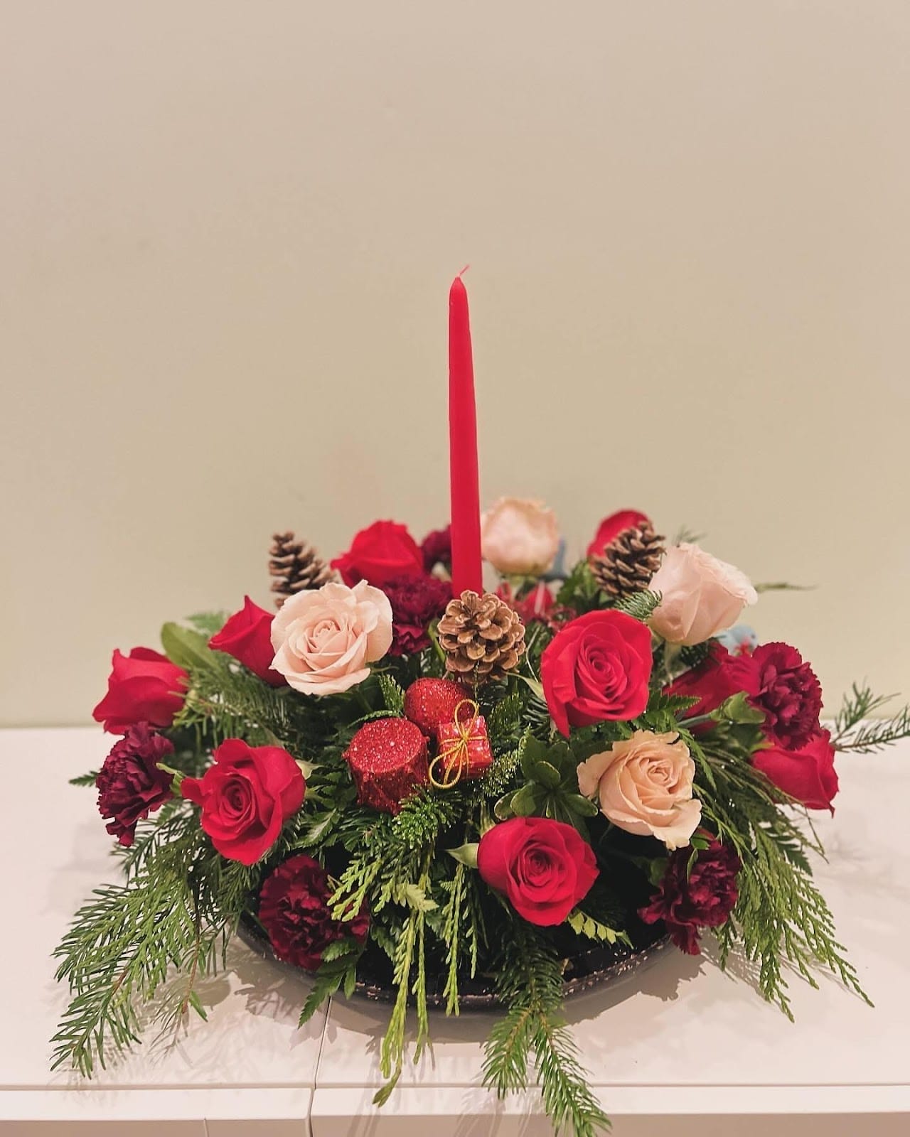 This year, add tradition to your home with a centerpiece from Flowers of the World. Glowing red candles paired with noble fir, white pine, and velvety roses bring seasonal charm to your table. Holly, berries, and pinecones complete these handcrafted designs, perfect for a warm and inviting Christmas atmosphere.