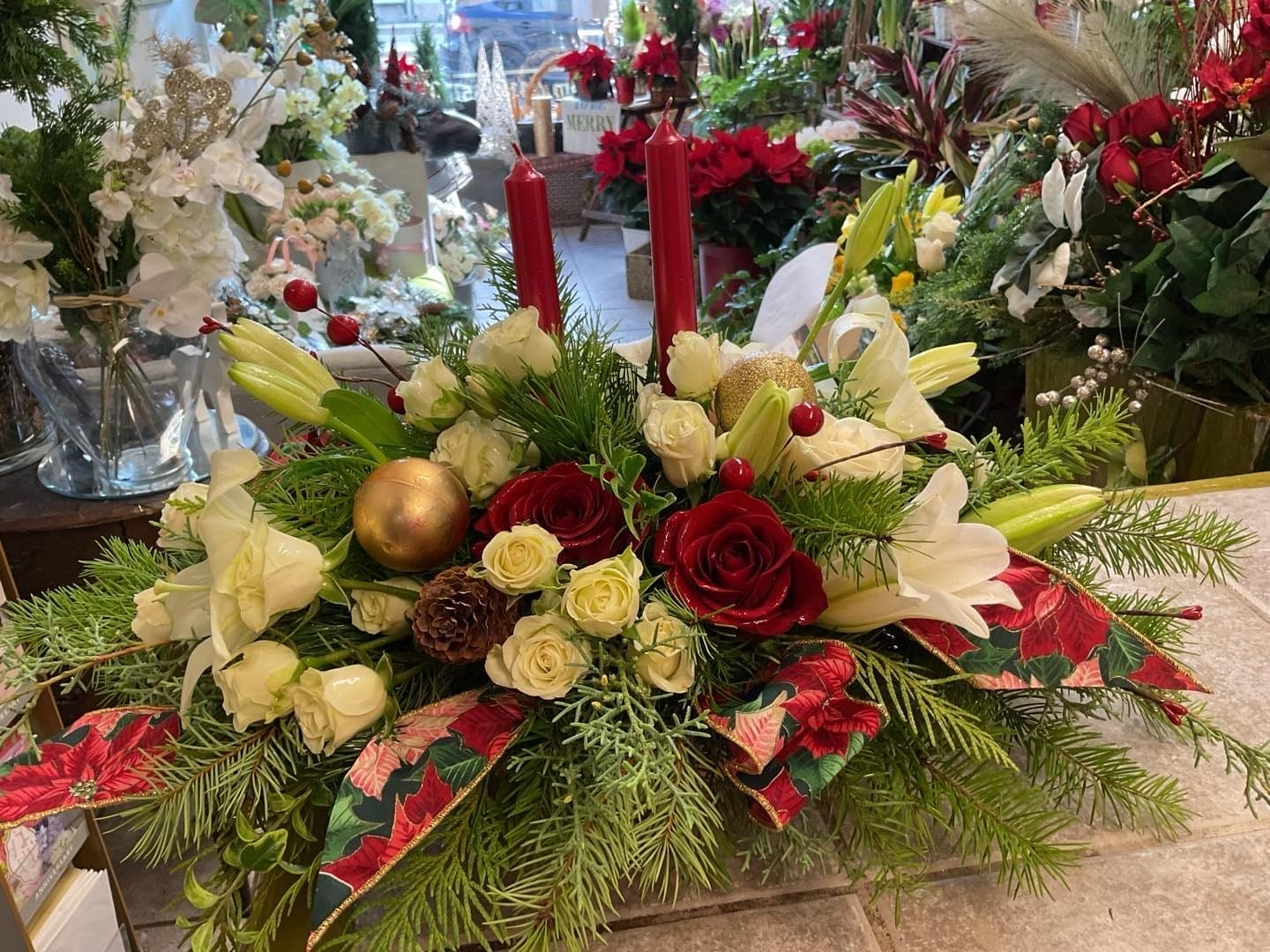Brighten your holidays with a centerpiece from Verdi Florist. Red and white roses, chrysanthemums, and festive greenery create a stunning arrangement with glowing tapered candles for extra charm.