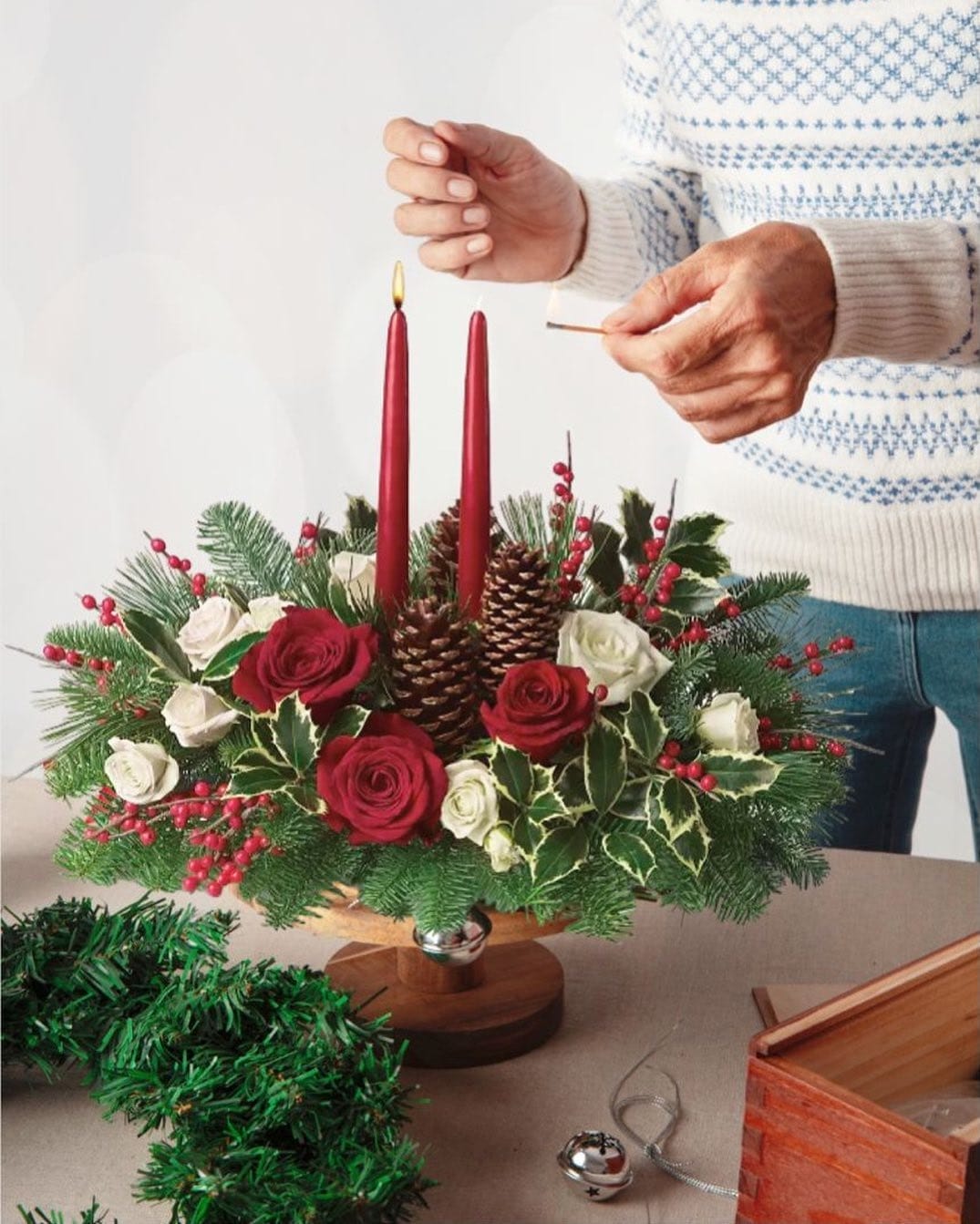 Make your table shine with a centerpiece from Garrett Florist. Their arrangements feature red and white roses, cheerful chrysanthemums, and festive touches like pinecones and holly. Two elegant tapered candles complete the look, creating a cozy glow for the season.