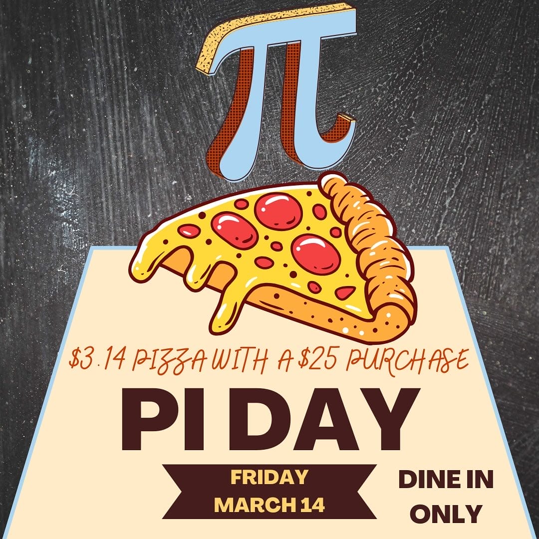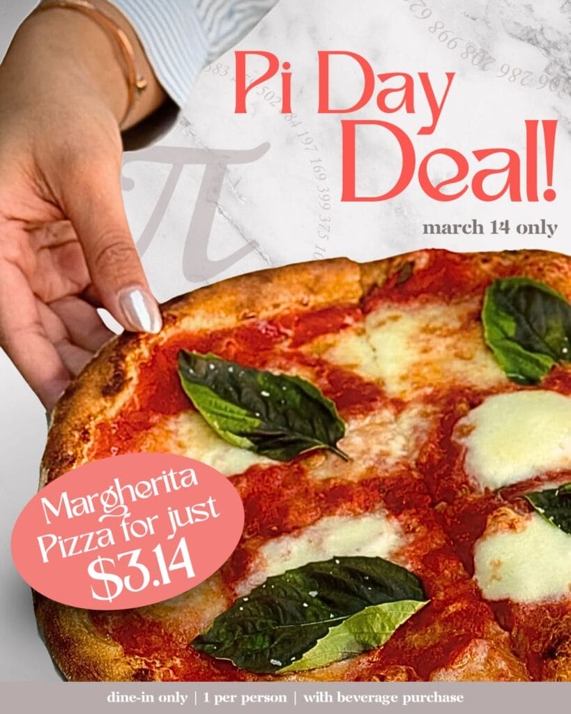 From 12:00 p.m. to 3:14 p.m., enjoy a Margherita pizza for $3.14 at any location. To redeem, customers must scan a Pi Day voucher received via email after signing up on the Pi Co. website.