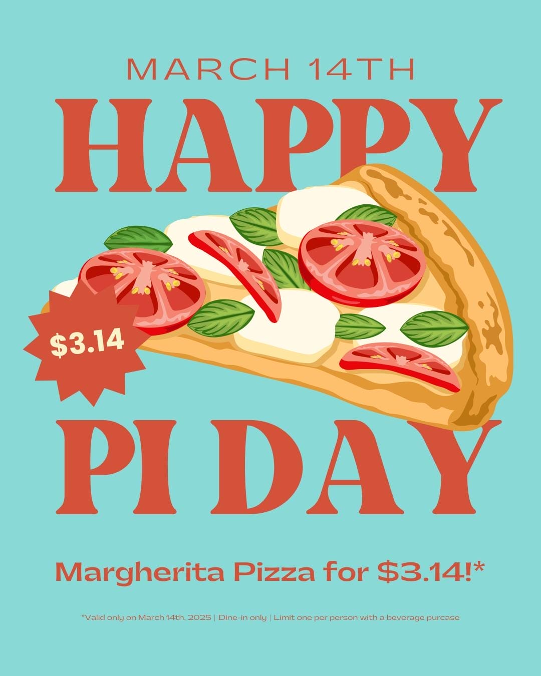 Customers can get a whole Margherita pizza for $3.14 with the purchase of a drink. This offer is available for dine-in only with a limit of one per person.